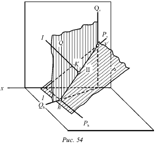 Для нахождения точки пересечения прямой и плоскости необходимо построить линии пересечения двух плоскостей. Рассмотрим прямую I и плоскость Р (рис. 54).