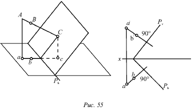 Прямая и плоскость перпендикулярны, если на плоскости можно найти две пересекающиеся прямые, перпендикулярные исходной прямой. В качестве подобной пары контрольных прямых легче всего рассматривать следы плоскости Ph и Pv (рис. 55). Это вызвано тем, что прямой угол между перпендикуляром к плоскости и следом Ph дает проекцию на горизонтальную плоскость без искажения, а угол между перпендикуляром и следом Рv проецируется на фронтальную плоскость V.