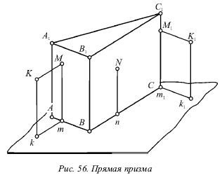 и пирамидаРассмотрим прямую призму, которая стоит на горизонтальной плоскости (рис. 56).