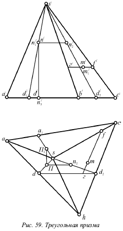 Из рассуждений, подобных рассуждениям в случае призмы, можно убедиться, что на фронтальной проекции невидима грань SAC (рис. 59).