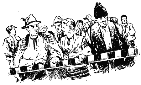 Безтурботно спершись на шлагбаум, стояло щасливе молоде подружжя. На кучерявій голові юного чоловіка — верховинського лісоруба або відважного плотогона — яскраво-зелений капелюх, облямований чорним шнурком і увінчаний райдужним пером. Тонкий стан чоловіка затягнений широким поясом з мідним набором блях, цвяшків, ромбиків і квадратиків. На міцні плечі недбало накинутий білий, найм'якшої вичинки, майже замшовий кептар — безрукавий кожушок, розшитий кольоровою вовною, з пишними китицями біля коміра. Груди полотняної сорочки вишиті шовковим і бісерним узором.