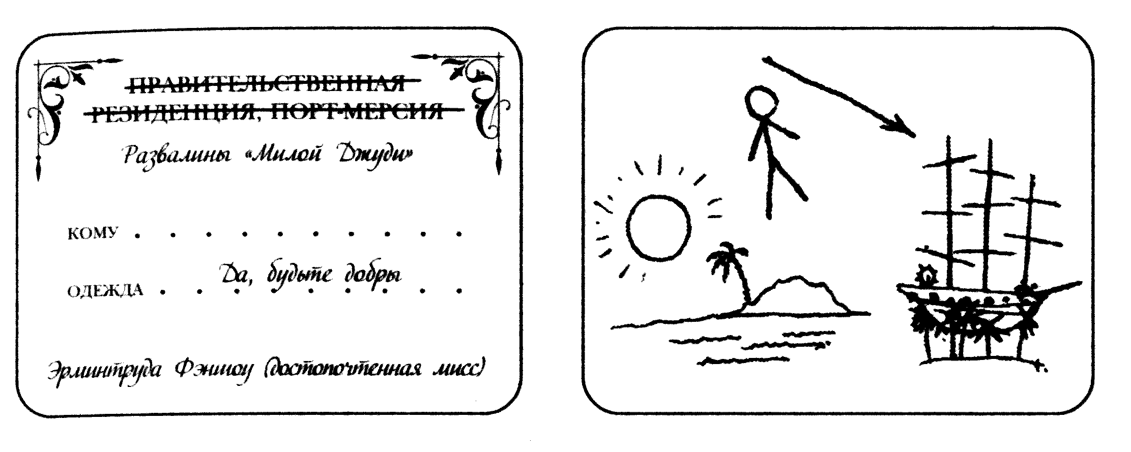 На белом прямоугольнике были бессмысленные значки, зато на обратной стороне — картинки. Мау знал, что такое послания, и разгадать это послание оказалось нетрудно.