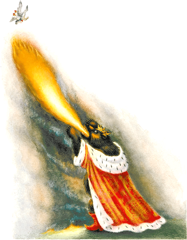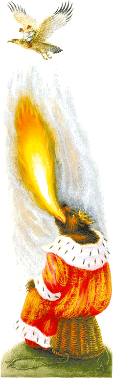 Они сели; ясный сокол поднялся выше дерева стоячего, ниже облака ходячего и полетел было в далёкие страны. На ту пору царь-медведь прибежал, усмотрел сокола в поднебесье, ударился головой в сырую землю и обжёг ему пламенем крылья. Опалились у сокола крылья, опустил он царевича и царевну наземь.