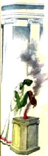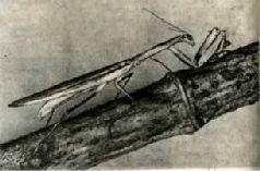 «Подстерегающий добычу богомол сидит в толще травы или среди листьев кустарника, приподняв кверху переднеспинку и передние ноги, голени которых вложены в бедра, как лезвие перочинного ножа. Этой характерной