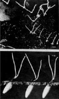Яйца водяного скорпиона ранатра, пронзающие лист водяной лилии. Обратите внимание на два длинных усика или рога, которыми снабжено каждое яйцо: в них скрыт тонко устроенный респираторный аппарат, снабжающий яйцо кислородом.