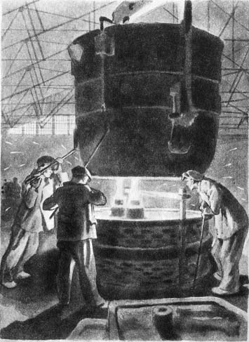 Ваня слушал, глядел и удивлялся на рабочих, которые шли возле ковша с расплавленным железом. Ваня стоял далеко от ковша — и то ему было жарко. А от рабочих валил даже пар. Железо стреляло огненными искрами. Но они работали не суетясь, спокойно, ловко, внимательно.