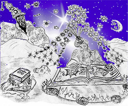 Взобравшись на бархан, Аль-Мажнун оцепенел от увиденного: огненный круг в свете луны и звезд, похожий на небесный шатер, весь светился от пиктограмм и магических знаков. В центре круга сидел Аль-Фарух, а перед ним, словно повисла в воздухе открытая книга с горящими буквами невиданного ранее языка.