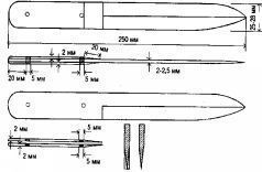 Длина = 250 мм, ручка = 100 мм, лезвие = 150 мм, т. е. лезвие полторы длины ручки, ширина = 25-28 мм. При изготовлении толщина заготовки должна быть от 2,2 мм до 2,5 мм. Толщина накладок ручки по 2 мм. Заклепок, держащих ручку с каждой стороны, можно делать 3, но обычно делается по 2 заклепки. Ширина заклепки – 5 мм.