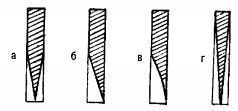 Сама заготовка ножа должна фрезероваться или затачиваться таким образом, чтобы режущая часть ножа была только с одной стороны. Заточи самой режущей кромки, могут быть 4-х видов, как показано на рис.3.