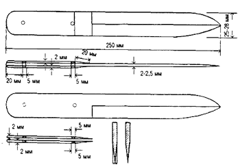 а в бою в тело противника, стала напоминать пулю. И вообще нож в профиль напоминал большую пулю, так как был, обтекаем, удобен и не имел ничего лишнего.Выработались также два размера ножа, так сказать, две его длины: одна — 25 см = 250 мм, другая — 30 см = 300 мм (рис.2). Но у себя в Школе мы как-то больше привыкли к первому размеру. Итак, поскольку мы уже определились, какой формы должен быть метательный нож, то назовем и остальные его параметры.