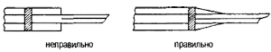 Рукоятка должна состоять из 2-х отдельных накладок из дюралюминия. Другие материалы — винипласт, дерево, резина быстро приходят в негодность от нечаянных попаданий ножом в нож и от ударов о стенд и пол. Часть ножа, предназначенная для рукоятки, не фрезеруется. В ней сверлится 2 отверстия по 5 мм под две заклепки из быстрорежущей стали, которая хорошо обрабатывается и отлично держит. Оба отверстия под клепки сверлятся в 20 мм от конца рукоятки от лезвия ножа. Причем обе накладки рукоятки у ближней заклепки стачиваются наискось (рис.4) к лезвию, чтобы рука метателя не встречала никаких углов и плоскостных перепадов при отпуске ножа в броске.
