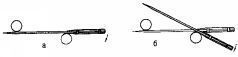 Вес ножа должен быть 200 г. Его балансировка проверяется таким образом: в то место, где рукоятка начинается от лезвия, ставится указательный палец, скажем, правой руки, а указательный палец левой руки слегка удерживает нож в горизонтальном положении у жала. При отпускании пальца левой руки рукоятка ножа, как бы задержавшись, ровно и безусловно должна потянуть нож к полу (рис.5). Если рукоятка ножа будет значительно тяжелее лезвия, то нож тут же упадет на пол в сторону рукоятки. Поэтому такую рукоятку просто необходимо облегчить.