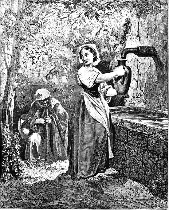 Нужно было этой бедной девочке, помимо других дел, ещё два раза на дню ходить по воду за добрые полверсты от дома и приносить её целый большой кувшин. Вот однажды у ручья подошла к ней бедная женщина и попросила напиться.