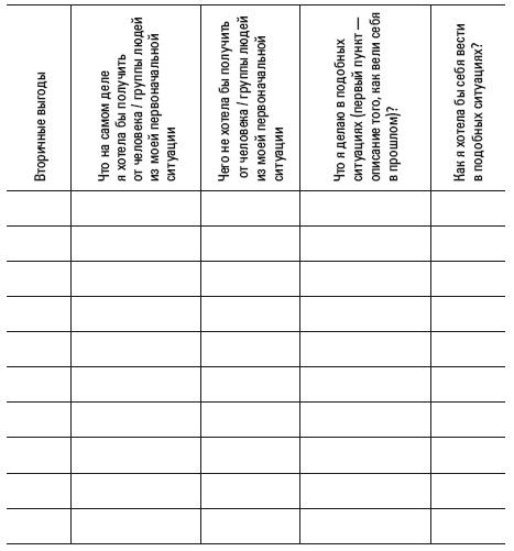 Здесь вам нужно будет обозначить свои вторичные выгоды, ответив на вопрос, почему вы до сих пор придерживаетесь стратегии из прошлого. Например: жалость к себе, образ жертвы, все, что угодно, что может явиться гарантом безопасности – то есть поможет избежать того, чего вы боитесь. Подумайте. Следующие графы – что бы вы хотели получить от того человека (или группы людей) из вашей самой болезненной ситуации на самом деле, чего не хотели бы от него (них) получить, что вы делаете в таких ситуациях и что хотели бы делать (как себя вести).
