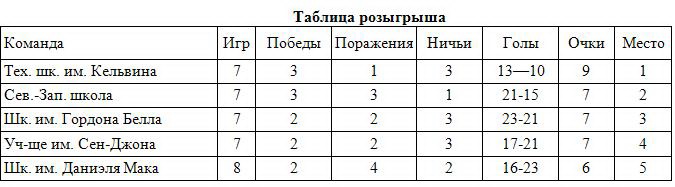 Положение в таблице таково, что три команды могут набрать одинаковое количество очков, – если сенджонцы победят кельвинцев, то у них станет девять очков, и столько же может набрать победитель матча между командами Северо-Западников и школы имени Гордона Белла. Но если кельвинцы побьют сенджонцев или даже сыграют вничью, то со своими 11-ю очками будут недосягаемы для соперников и станут победителями чемпионата. В случае, если встреча Северо-Западников с гордонбелловцами не закончится вничью, победитель с 9-ю очками займет вторую строчку в таблице».