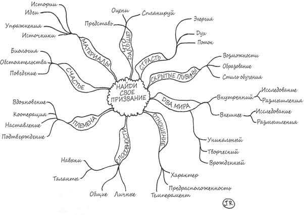 Создание «карт мыслей» [6] – это техника визуального отображения информации, облегчающая работу с ней. В центре такой карты находится основная идея, ядро, из которого расходятся «ветви» производных идей, мыслей и образов. Для создания карты необходимо выбрать основную мысль (тему), поместить ее в центр и обвести кружочком. Затем начертить исходящие из кружка линии, соответствующие связанным с этой идеей мыслям и соображениям. Их число ничем не ограничено, кроме того, от них тоже могут при необходимости отходить новые «ветви».