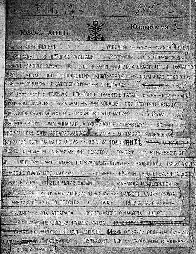 Юзограмма капитана 2-го ранга А. Д. Кира-Динжана о бое с германскими катерами 25.09.1917 года (РГАВМФ. Ф. 481. Оп. 1, Д. 10, Л. 244)