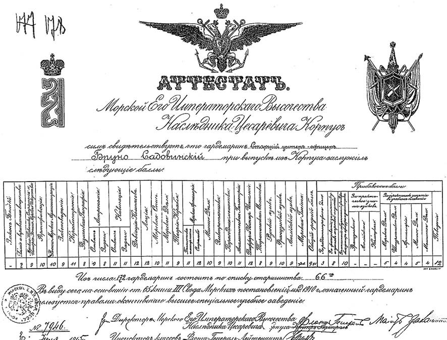Аттестат об окончании Морского корпуса гардемарина Б.-С. А. Садовинского (РГАВМФ. Ф. 432. Оп. 3. Д. 178. Л.1)