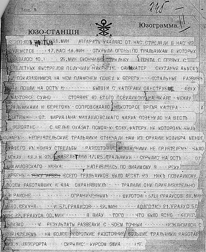 Юзограмма капитана 2-го ранга А. Д. Кира-Динжана о бое с германскими катерами 25.09.1917 года (РГАВМФ. Ф. 481. Оп. 1, Д. 10, Л. 245)