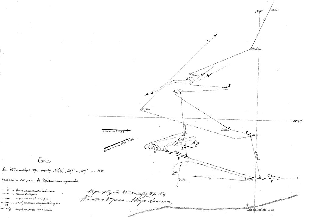 Схема маневрирования катеров 2-го дивизиона во время боя 25 сентября 1917 года, составленная командиром дивизиона капитаном 2-го ранга А. Д. Кира-Динжаном (РГАВМФ. Ф. 481. Оп. 1. Д. 84. Л.9)