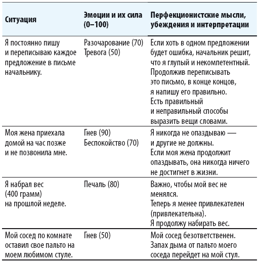 Прежде чем вы научитесь изменять пефрекционистский образ мышления, важно научиться определять такие мысли, интерпретации и убеждения. Использование мониторинга мыслей, например, предложенного здесь, может помочь вам отследить такие мысли. В следующий раз, когда вы почувствуете дискомфорт, считая, что недостаточно хорошо справились с работой, или расстроитесь из-за поведения окружающих, постарайтесь заполнить эту таблицу. Возможно, вы захотите создать свою собственную таблицу на листе бумаги, потому что в примере, предложенном этой книгой, места недостаточно.