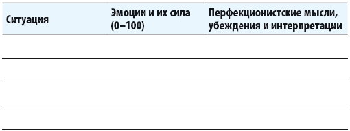 После прочтения заполненного образца в первой колонке пустого варианта запишите ситуации, которые вызывают ваши перфекционистские мысли или заставляют вас обратить на них внимание. Во второй колонке запишите эмоции, которые вы переживаете (например, страх, тревогу, печаль, подавленность и т. д.). Также запишите силу этой эмоции, используя шкалу от 0 до 100, где 0 означает «нет», а 100 равно самой сильной эмоции. В третьей колонке запишите свои перфекционистские убеждения и мысли.
