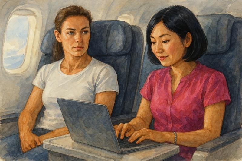 Они замолчали. Гул моторов становился все громче, самолет дернулся и покатился ко взлетной полосе. По салону пробежала едва уловимая дрожь, как будто внутри огромного механизма проснулось живое существо.
