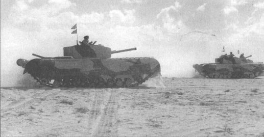 Тяжелые танки МК IV «Черчилль III», поступившие в 8-ю армию для испытаний в пустынных условиях. Они были вооружены 57-мм пушкой. Северная Африка, осень 1942 года