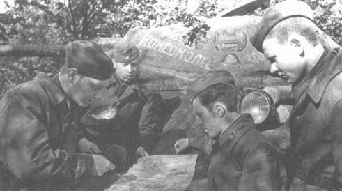 Комсомольский экипаж гвардии лейтенанта И. П. Калюжного за изучением местности предстоящего наступления. На заднем плане виден танк Т-34–76 с индивидуальным названием «Комсомолец Забайкалья». Воронежский фронт, июль 1943 года