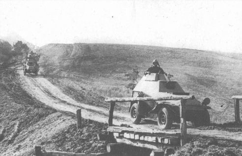 На марше передовое подразделение 5-й гвардейской танковой армии — разведчики на бронеавтомобилях БА-64. Воронежский фронт, июль 1943 года