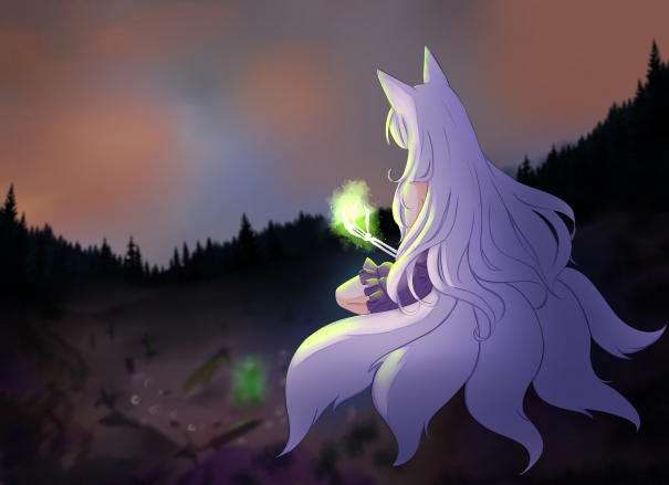 волосы на фоне тёмного леса придавали образу кицунэ волшебности. Этому же способствовали пять пушистых хвостов с роскошным серебристым мехом. Девушка держала перед носом тлеющую щепку, вдыхая аромат горящей древесины, но всё равно с её лица не пропадало выражение омерзения и презрения.– Не зря вы все – низшие. Мясо воняет просто отвратительно! – проворчала Ками и щёлкнула пальцами костлявой руки, заставив скелет рассыпаться на части, после чего встряхнула ладошкой и придала ей обычный вид.