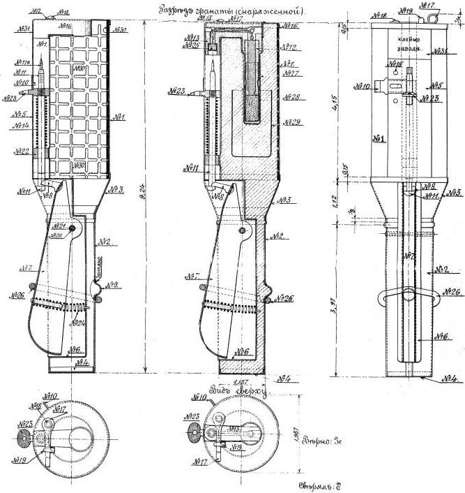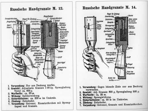 полученные 64 пехотным Казанским полком в 3 парке 16 парковой артиллерийской бригады по талону от 2 сего мая за № 12 тысячу двести (1200) гранат образца 1914 года, причём оказалось: семьсот семьдесят гранат (770) совершенно не пригодны к употреблению в бою, так как у большинства из них от небрежного хранения перержавела пружина рычага, благодаря чему рычаг не действует и у некоторых перержавела защёлка, придерживающая капсюль, а поэтому неисправные гранаты, в числе семьсот семьдесят (770) штук подлежат сдаче обратно в 3 парк, что и постановили занести в сей акт».Немецкие памятки со схемами и характеристиками руских гранат образца 1912 и 1914 годов