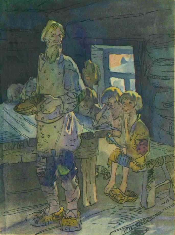 А у Ивана-бедняка всей скотины — что лягушка в тине да кошка в лукошке. А ребят семеро. Семеро ребят — все на лавочке сидят, каши гречневой хотят. А в доме ни крупинки, ни мучинки. Делать нечего, пошёл Иван-бедняк к богатому брату.