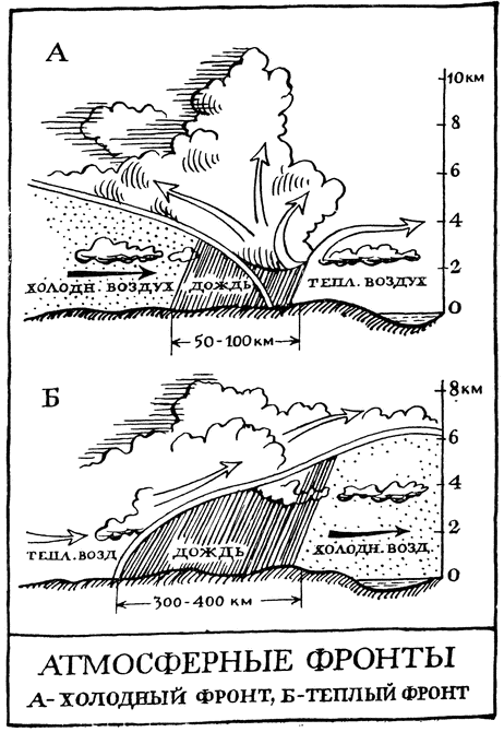 Но, быть может, не стоит преждевременно восторгаться ими, ибо перистые облака — предвестники ненастья, признаки изменения погоды к худшему. Они — разведчики, первые посланники пока еще отдаленных «фронтов», где происходит грандиозная борьба между теплыми и холодными воздушными массами, каждая из которых пытается установить свое господство.