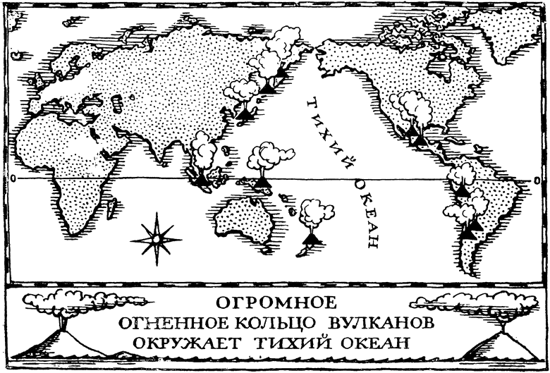 Большинство вулканов земного шара расположено в береговой зоне Тихого океана, в «огненном кольце Земли». Цепи огнедышащих гор тянутся по Южно-Американскому и Северо-Американскому континентам, по окраине Аляски, в них звеньями входят наши камчатские и курильские вулканы, а также японские, малайские, филиппинские, зондские и многие другие. В «огненном кольце» более 300 действующих вулканов.