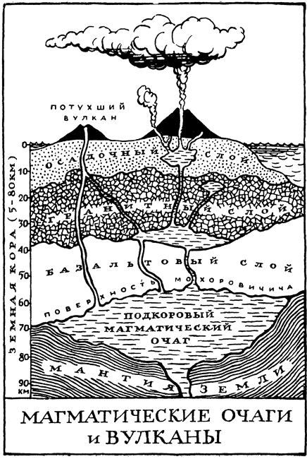 Лава чаще всего поднимается с глубины от 50 до 100 километров, причем температура ее более 1000–1200 градусов. Отсюда вулканологи делают вывод, что в очаге ее температура еще выше — около 1500 градусов. Но почему магма так там нагрета? Может быть, под влиянием солнечного тепла?