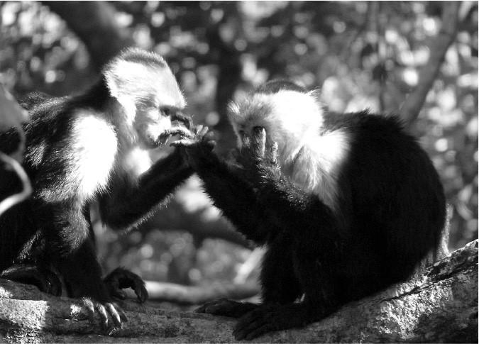 Не менее поразительны причудливые социальные условности, бытующие у коста-риканских капуцинов, – о них мир узнал благодаря обстоятельным многолетним исследованиям, которые вели приматолог из Калифорнийского университета Сьюзан Перри и ее коллеги {176} . Ученые выяснили, что в отдельных популяциях у этих обезьян довольно необычные региональные привычки, в числе которых обнюхивание чужих ладоней, посасывание разных частей тела друг у друга, тыканье пальцами друг другу в рот и глаза {177} . Например, в одной из групп в заповеднике Ломас Барбудал у обезьяньих пар принято одновременно засовывать пальцы друг другу в нос и оставаться в таком положении несколько минут, иногда покачиваясь, будто в трансе. В двух других группах (Куахиникильская и Станционная стаи) к обнюхиванию ладоней добавляется сосание пальцев, тогда как у обезьян в Пелоне отмечен обычай погружать свой палец в глаз партнера таким образом, что он на целую фалангу входит между веком и глазным яблоком (илл. 1). О функции этих специфических для всей стаи или для более малой группы социальных условностей можно только догадываться – предполагается, что они нужны капуцинам ради проверки прочности взаимоотношений. Такой же полнейшей загадкой, в отличие от находящей вполне функциональное объяснение привычки японских макак мыть продукты, остается подмеченная в нескольких популяциях того же вида манера часами колотить одним камнем о другой {178} . Возможно, это зачаток каких-то музыкальных упражнений, возможно, социальный сигнал, а возможно, побочное следствие скуки или избытка времени.