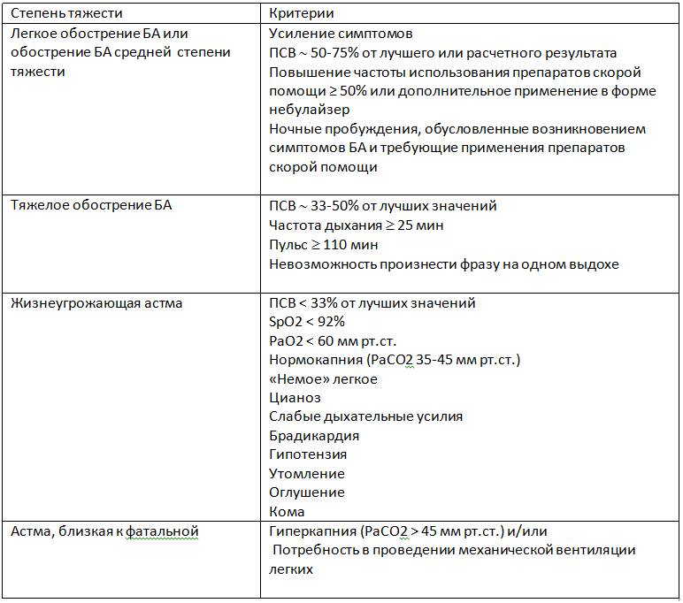 Степень тяжести обострений БА у пациентов от 6 лет и старше устанавливается по клиническим критериям. Для определения тяжести обострения достаточно наличие хотя бы одного из соответствующих критериев.