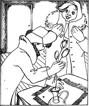 На столе, в вазе, стоят цветы — они были к маминому дню рождения. Антон вытряхивает их из вазы.