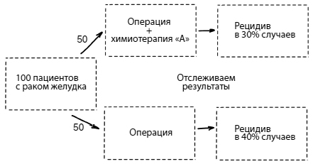 Для того чтобы понять, какой подход действительно будет лучше, нам нужно провести исследование, которое может выглядеть так: мы берем 100 пациентов с раком желудка, случайным образом делим их на две группы, и одна группа пациентов после операции получает несколько курсов химиотерапии «А», а пациентам из второй группы просто выполняют операцию без химиотерапии. После этого пациентов из обеих групп отслеживают в течение некоторого времени, чтобы посмотреть, в какой группе результаты лечения будут лучше.