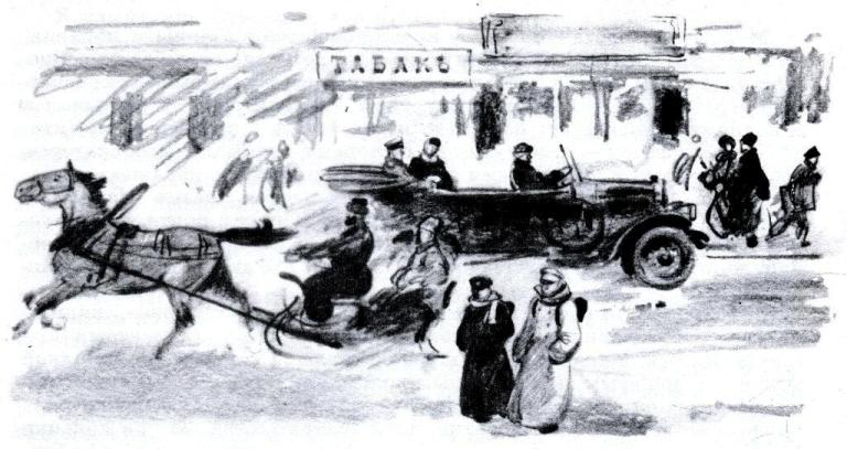 Порявкивая клаксоном, автомобиль выбрался на торцы Невского. Пропустили мимо лакированную карету, Катя попросила шофера дать возможность проехать и извозчику, который пугливо настегивал лошадку, чтобы поскорее убраться с главного столичного проспекта, — и мы поехали.