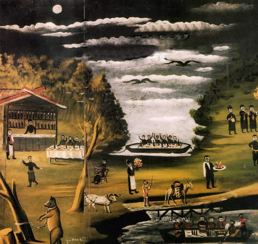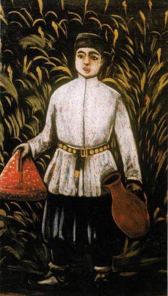 писал о Пиросманашвили, приходилось отмечать его оригинальность, несхожесть с представлениями о «настоящем художнике». А вот имеющим опыт собирательства или просто постоянного любопытства к наивным художникам, а помимо вашего покорного слуги - автора - таких наберется порядочно среди нынешней интеллигенции, как раз приходится удивляться тому, как похож был Пиросмани на других известных мастеров наивного искусства в России или во Франции, или в других странах. Рассказывая о его картинах, не можешь отделаться от ощущения их магии, их удаленности от реального, как будто это зарисовки путешественника, побывавшего в иных мирах. Эти иные миры теперь привлекают на экскурсии многих, причем не художников, а тех, кто стремится к опыту измененного сознания,психоделики и другим авантюрам практического разума. Оказывается, в нас живет не только осознаваемое нами «я», но и подсознание,бессознательное, супер-эго, наше астральное тело, душа, и окружает нас цветная аура. Иной раз, начитавшись популярных книг о саморегуляции личности, экстрасенсорных способностях и прочем, чувствуешь себя как-то неуютно: в твоем довольно-таки тесном теле проживают еще и незнакомые беспокойные соседи. И при этом лезут в твои дела. Именно к ним апеллирует телевизионная реклама, на них опираются в своих призывах любимые толпой вожди, их привлекают или отталкивают продающиеся в магазинах вещи.Мальчик несет еду