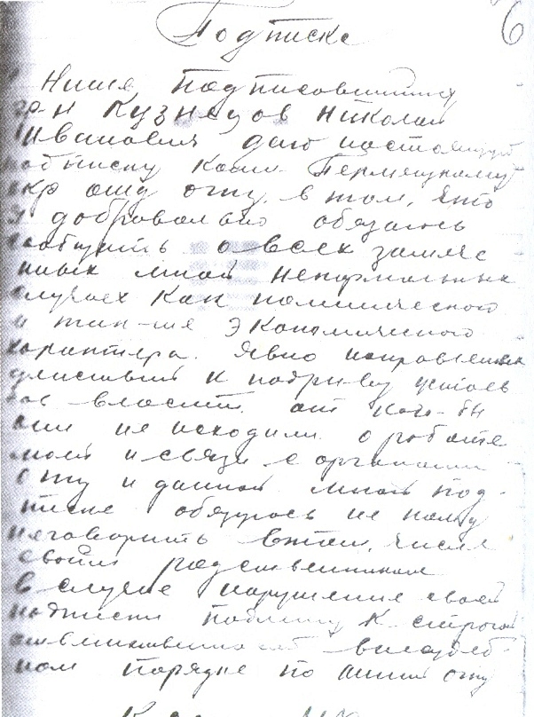 «Я, нижеподписавшийся гр-н Кузнецов Николай Иванович, даю настоящую подписку Коми-Пермяцкому Окр. Отд. ОГПУ в том, что я добровольно обязуюсь сообщать о всех замеченных мною ненормальных случаях как политического и так же экономического характера. Явно направленных действий к подрыву устоев Сов. Власти, от кого бы они ни исходили.