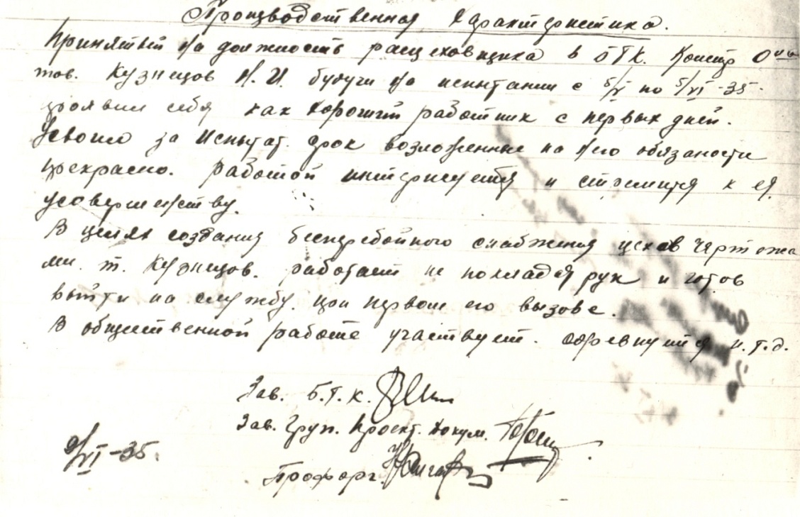 «Принятый на должность расцеховщика в БТК Конструкторского отдела тов. Кузнецов Н.И., будучи на испытании с 5/V по 5/VI-35 г, проявил себя как хороший работник с первых дней. Усвоил за испытательный срок возложенные на него обязанности прекрасно. Работой интересуется, стремится к ее усовершенству. В целях создания бесперебойного снабжения цехов чертежами т. Кузнецов работает не покладая рук и готов выйти на службу при первом его вызове. В общественной работе участвует, соревнуется и т.д.».