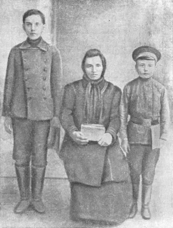 Н. Островский (справа) с матерью и старшим братом Дмитрием (1913).