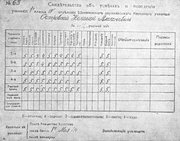 Он учился тогда в двухклассном народном училище и был одним из лучших учеников. Сохранилось «Свидетельство об успехах и поведении» ученика Шепетовского двухклассного училища Н. Островского за 1917/18 год. Из 60 отметок 56 пятерок и только 4 четверки.