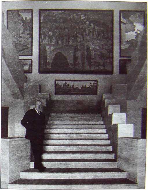 Н.К. Рерих в музее своего имени на фоне картин "Сокровище Ангелов" (1905) и "Соловецкий монастырь" (1923). Нью-Йорк, США. Июнь — июль 1929 г.