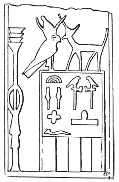 Древнейшая его форма обнаружена на гранитных колоннах, возведенных в храме в Иераконполе царем Хасехемуи из II (Тинитской) династии (рис. 21). На протяжении долгого времени два возможных его толкования существовали параллельно. Некоторые считали, что здесь изображена колонна с четырьмя капителями, одна над другой, а скорее всего, это изображение четырех колонн, расположенных одна за другой, в соответствии с египетскими правилами перспективы. Другие считали это стволом дерева, изображенного очень условно, с обрубленными сучьями. Это последнее толкование представляется наиболее вероятным.