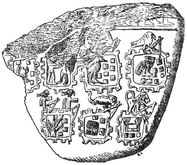Титул Гора состоит из имени, такого как Aha, «Воина», начертанного на схеме царского дворца с Соколом (Гором), восседающим наверху (рис. 30). Это означает, что царь является живым воплощением на земле: а) Сокола, б) Гора (по-гречески ’).
