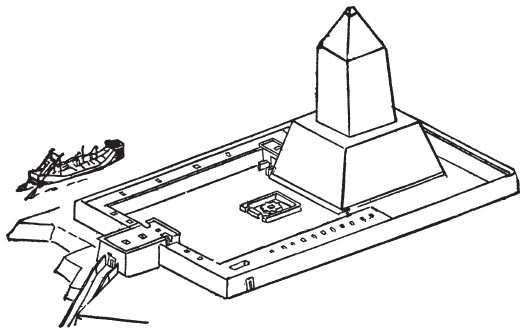 Рис. 46. Солярный храм V династии. Перед обелиском – жертвенник. Вечерняя ладья Солнца справа от храма